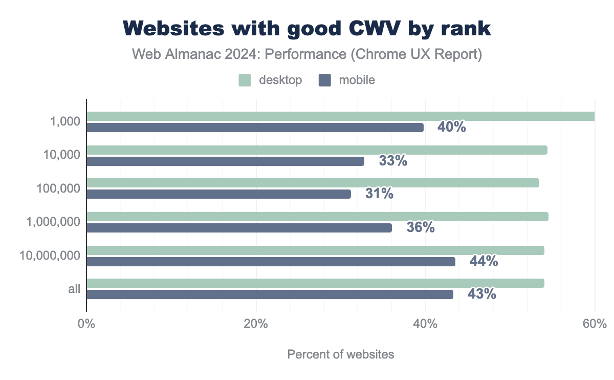 Figure 9.2. The percent of websites having good CWV, segmented by rank and desktop vs mobile.