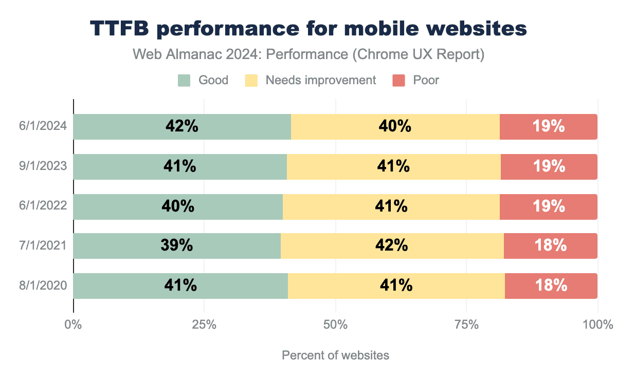 Over the past five years, the percentage of mobile web pages with good TTFB has remained stable, from 41% in 2021 to 42% in 2024. The percentage of pages that need TTFB improvements has decreased by 1%, and unfortunately, the percentage of pages with poor TTFB remains the same. Since this metric has not changed significantly, we can conclude that there have been no major improvements in connection speed or backend latency.