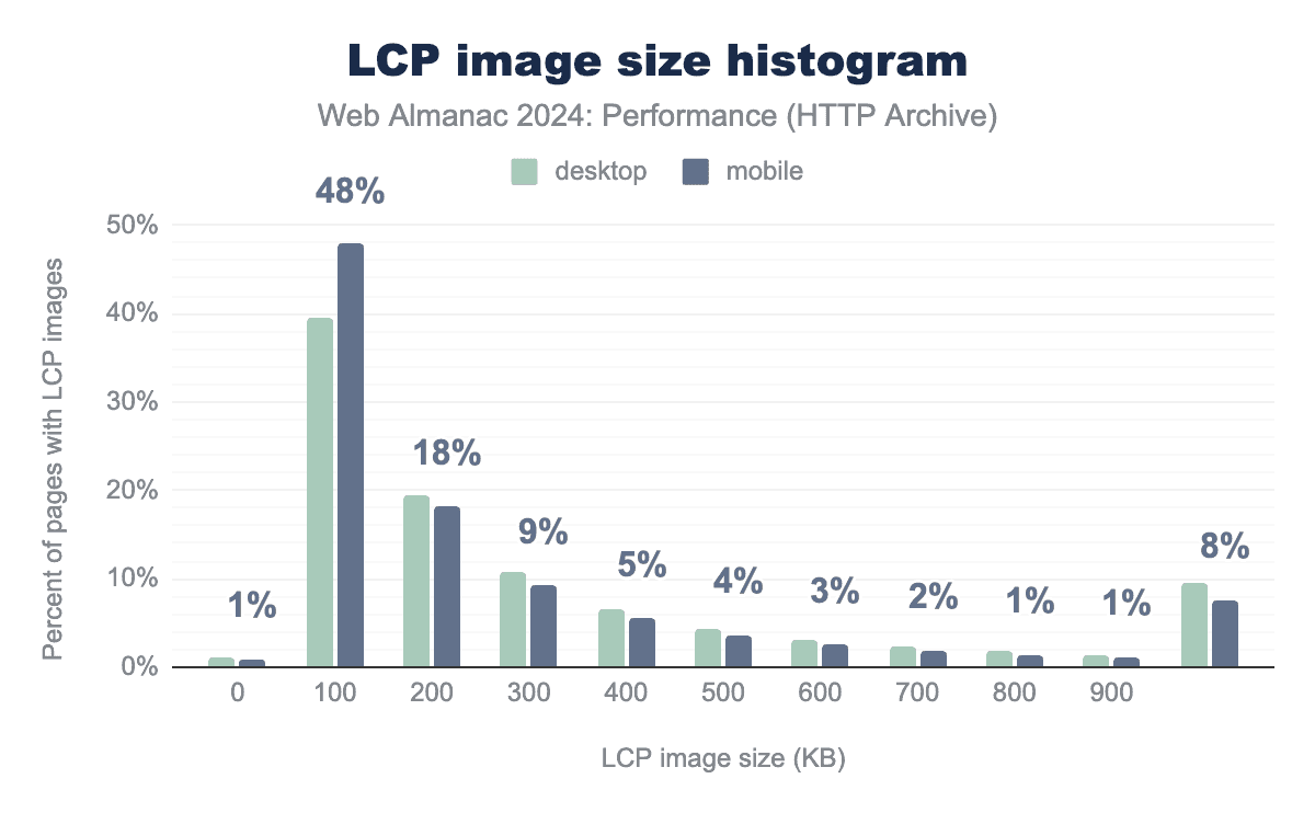 In 2024, 48% of mobile websites used an LCP image that was 100KB or less. Though, for 8% of the mobile pages the LCP element size is more than 1000KB.