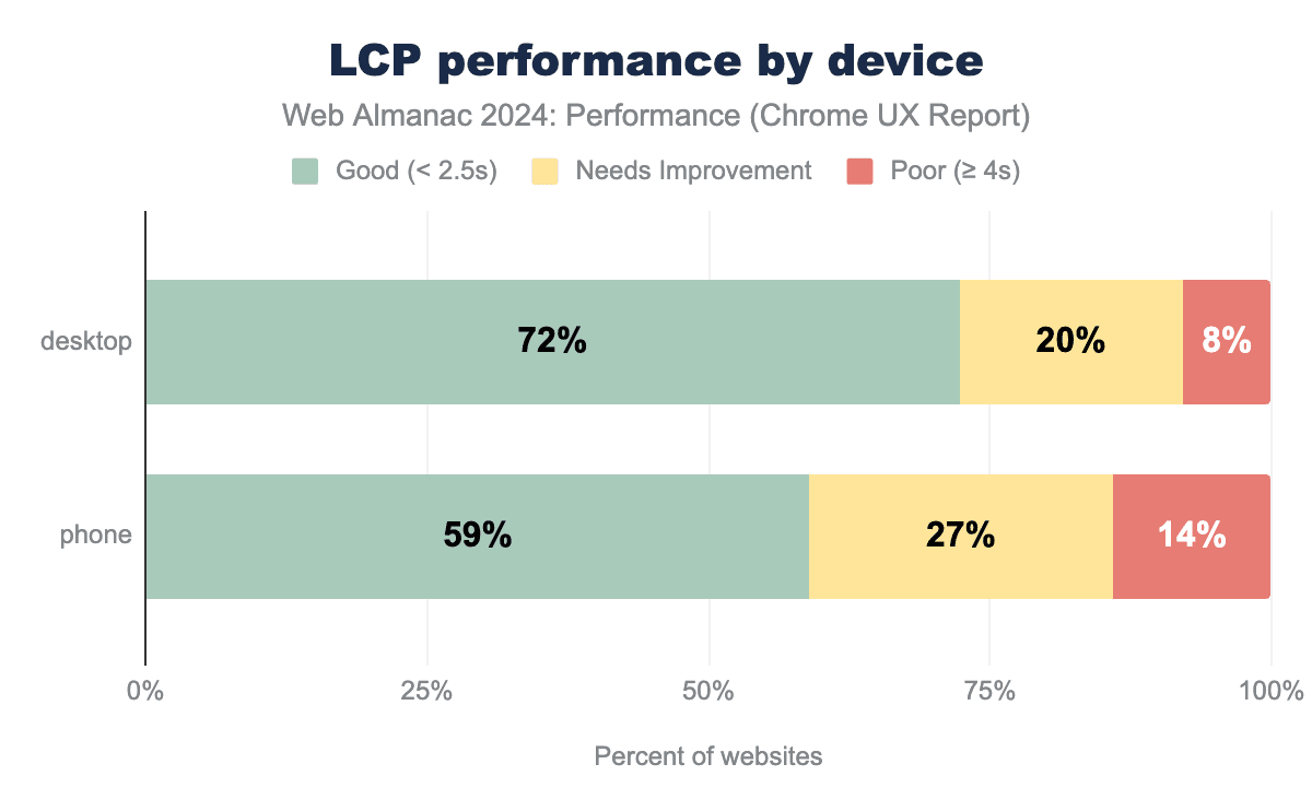 The good news is that in 2024, fewer websites are using this performance anti-pattern. In 2022, 18% of mobile websites were lazy-loading their LCP images. By 2024, this decreased to 16%.