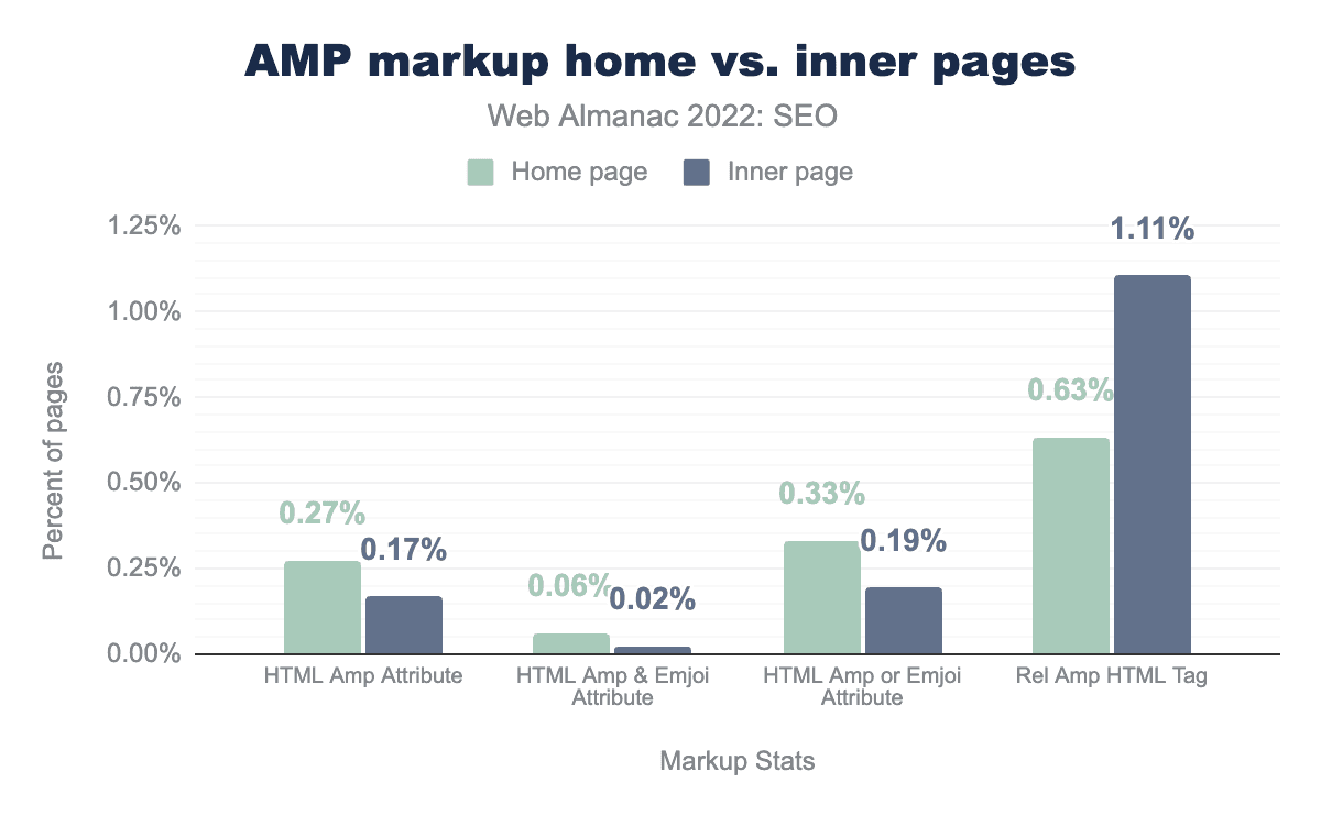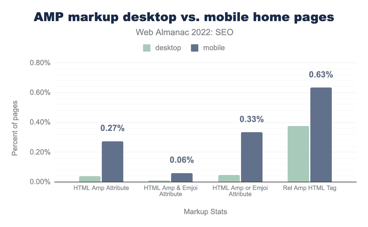 That’s why it’s a little surprising there was a slight uptick in the percentage of pages containing the amp html attribute. In 2024, it went up to 0.27% for mobile crawls compared to 0.19% in 2022. The desktop crawls, however, dropped to just 0.04%, down from 0.07% in 2022.