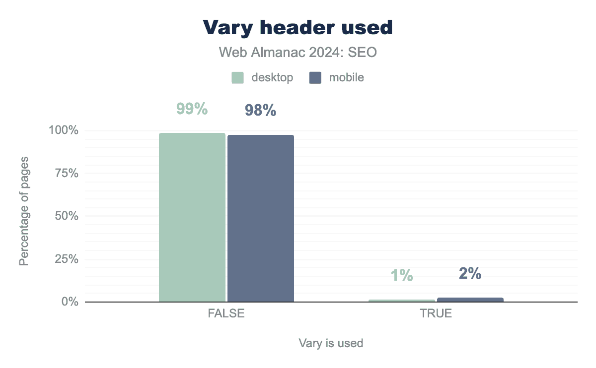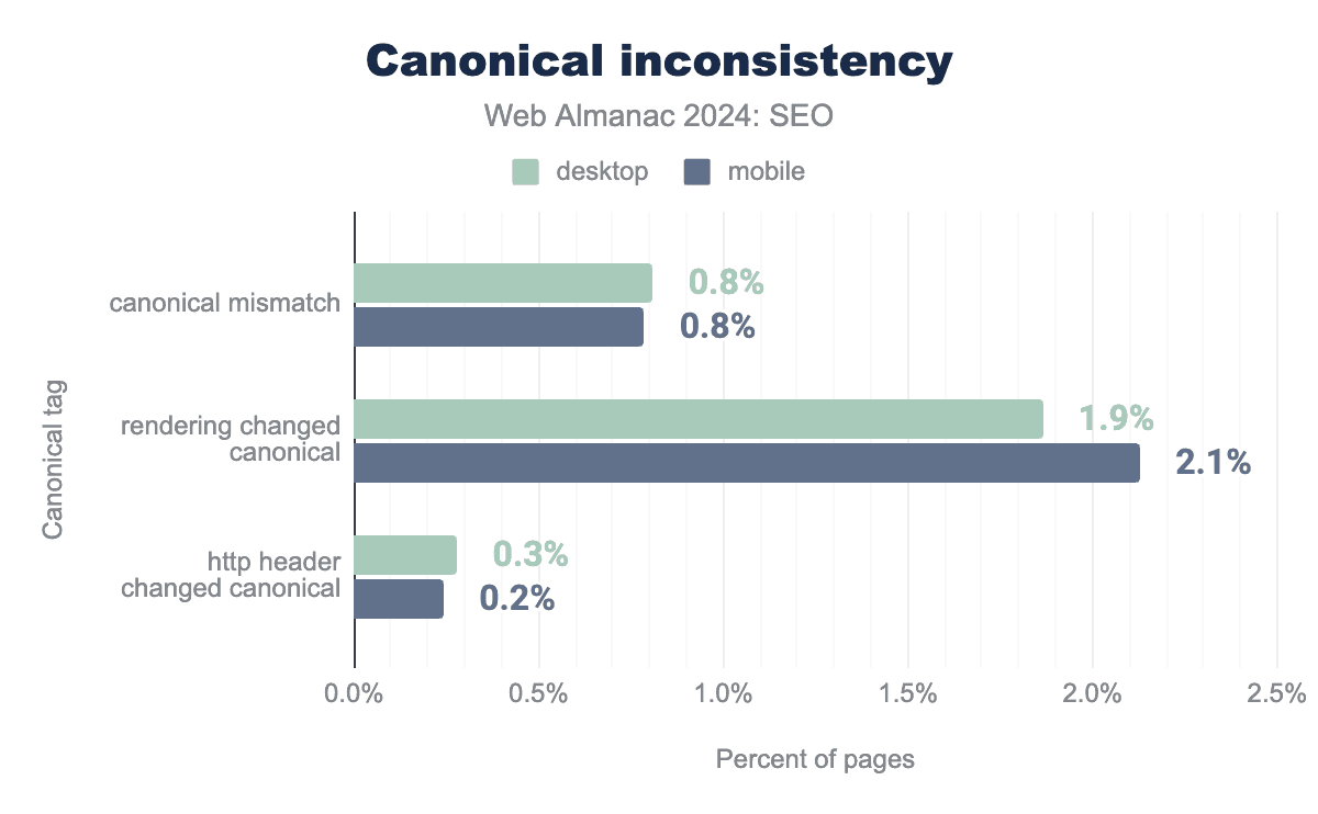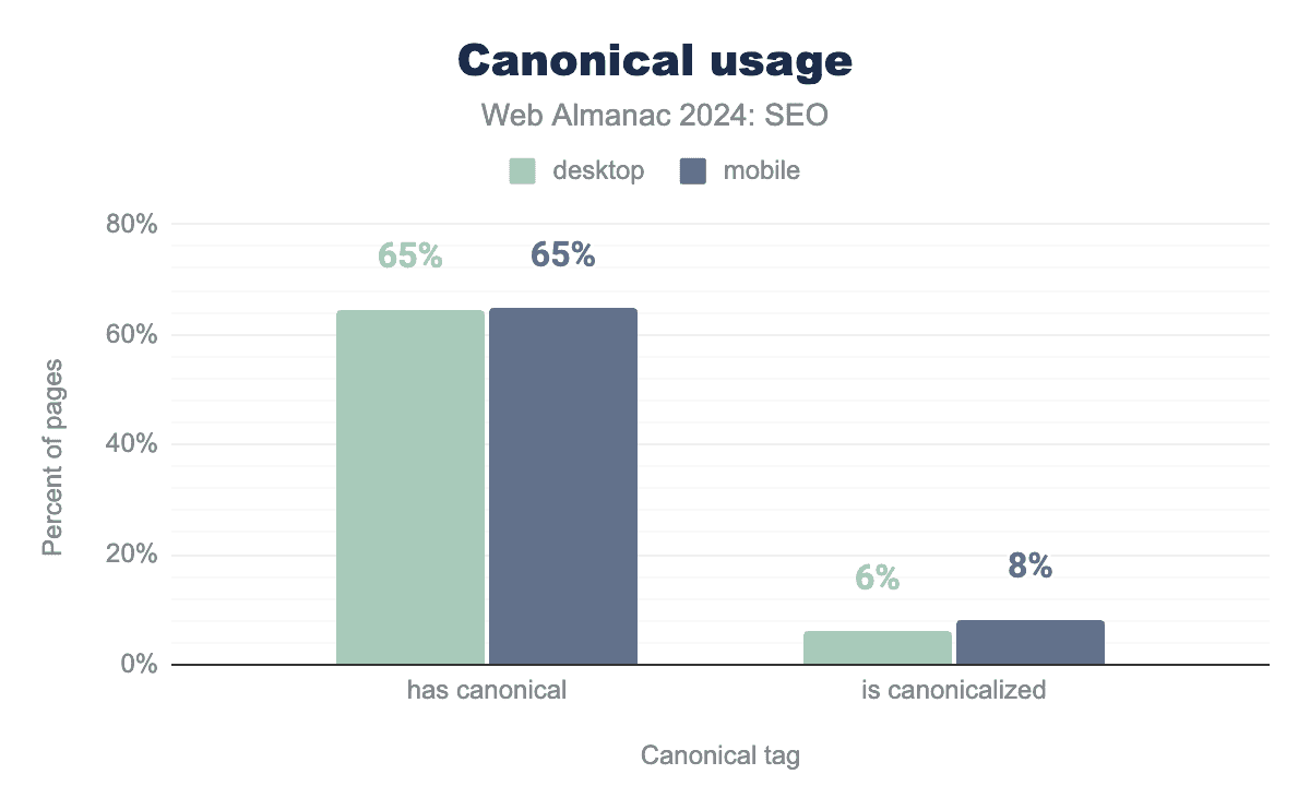 canonical tag usage was up slightly in 2024. In 2022, 61% of mobile and 59% of desktop pages used canonical tags. In 2024, it was up to 65% of mobile and 69% of desktop pages.