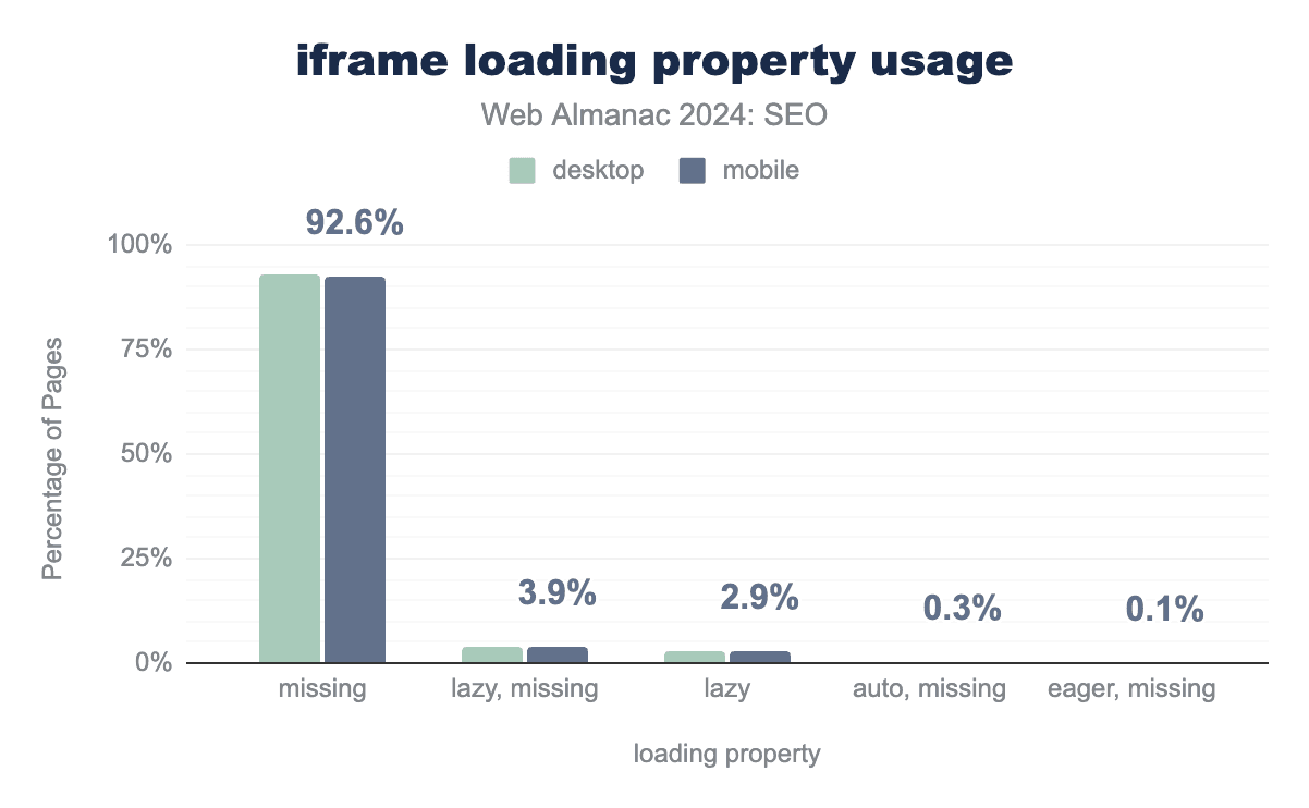 The presence of an <iframe> provides a baseline for cases where the indexifembedded robots directive might be applicable. In 2024, 7.6% of mobile pages contained an <iframe> element. This is a noteworthy increase of 85% from 2022’s rate of 4.1%.