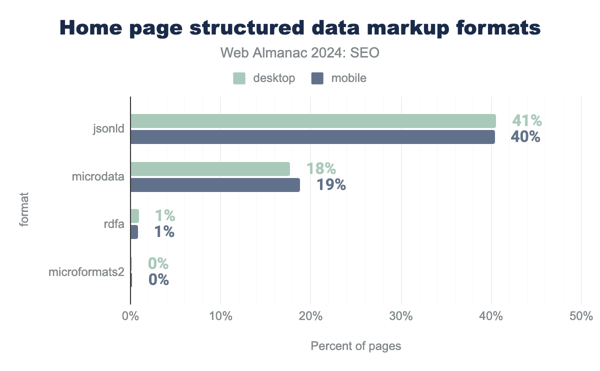 There are a number of different ways structured data can be implemented on a page, but JSON-LD is by far the most popular format for home pages. It accounts for 40% of mobile and 41% of desktop home pages crawled.