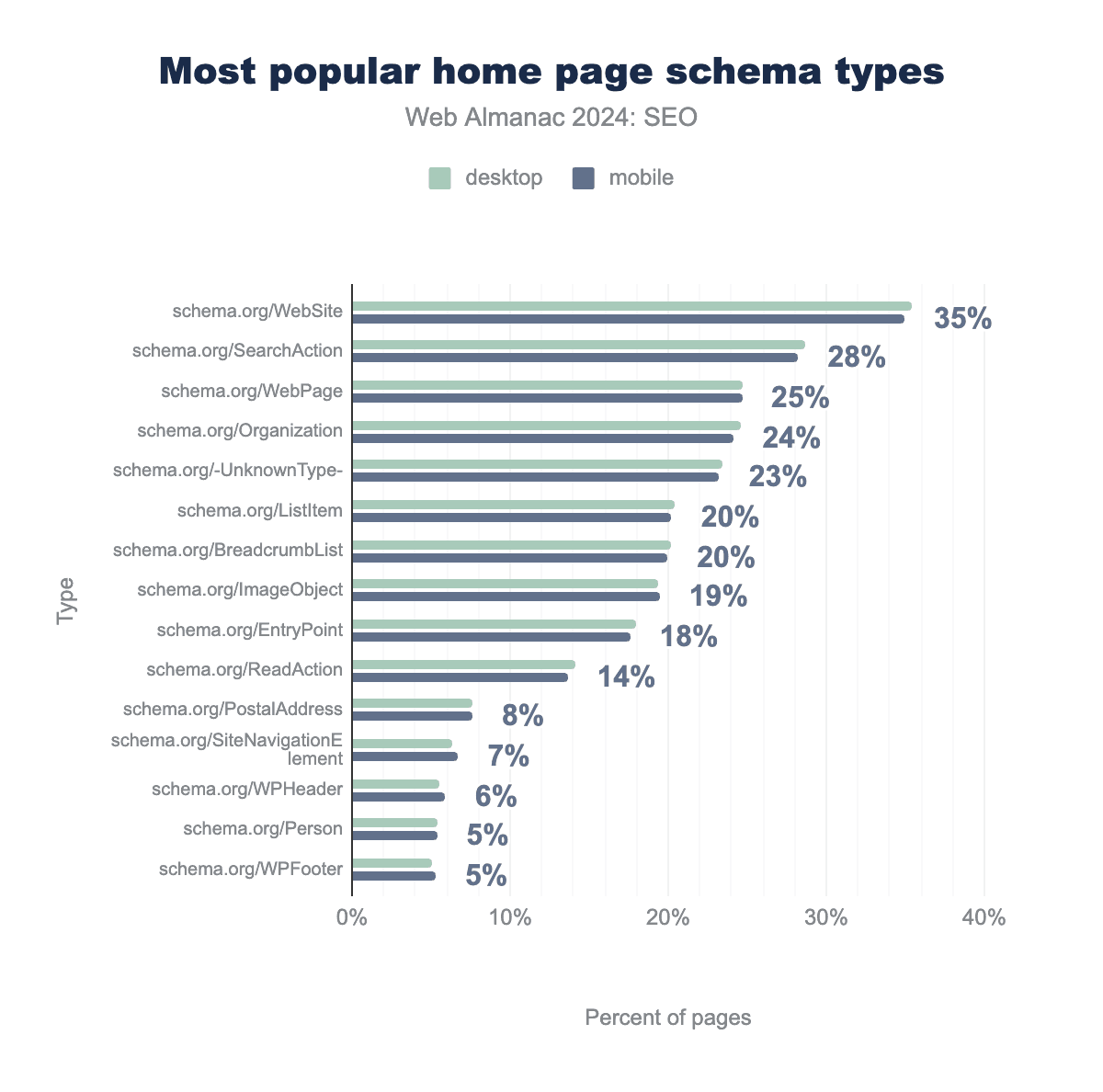 schema.org/WebSite was found on 35%, schema.org/SearchAction on 29%, schema.org/WebPage on 25%, schema.org/Organization on 25%, schema.org/-UnknownType- on 24%, schema.org/ListItem on 20%, schema.org/BreadcrumbList on 20%, schema.org/ImageObject on 19%, schema.org/EntryPoint on 18%, schema.org/ReadAction on 14%, schema.org/PostalAddress on 8%, schema.org/SiteNavigationElement on 6%, schema.org/WPHeader on 6%, schema.org/Person on 5%, schema.org/WPFooter on 5%. For mobile, they were found on 35%, 28%, 25%, 24%, 23%, 20%, 20%, 20%, 18%, 14%, 8%, 7%, 6%, 5%, and 5% of pages, respectively.Compared to 2022, there wasn’t a big shift in 2024 in terms of the popularity of structured data types found on home pages. WebSite, SearchAction, and WebPage remained the three most popular schema types since they power the Sitelinks Search Box on Google.