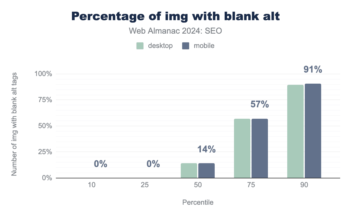 The most prevalent <head> breaking tag was the <img> element, affecting 29% of desktop and 22% of mobile instances of the issue. Comparatively, the 2022 chapter found <img> tags misapplied on 10% of mobile pages and 10% of desktop pages. The likely difference comes from deprecated implementation methods for third-party tools.