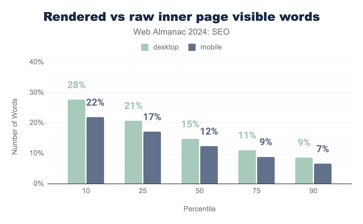 When the rendered visible and raw word counts are compared on home pages, there’s a surprisingly small discrepancy, with the median showing a difference of 13.6% for mobile and 17.5% for desktop.