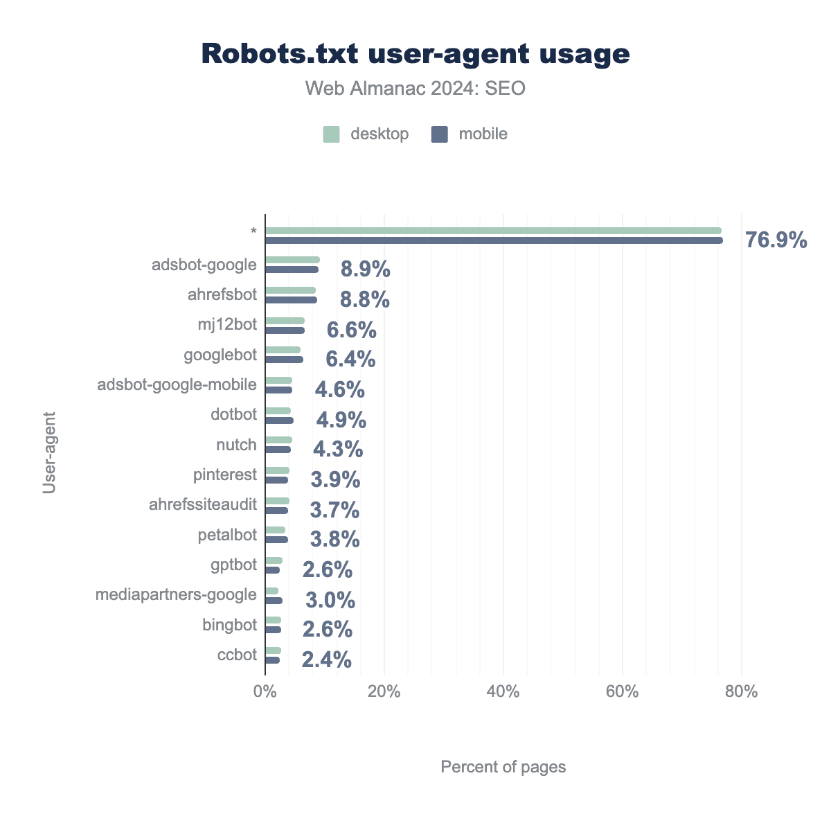 user-agent targets in robots.txt files. For desktop * is 76.6%, AdsBot-Google is 9.1%, AhrefsBot is 8.6%, MJ12Bot is 6.7%, Googlebot is 5.9%, AdsBot-Google-Mobile is 4.6%, Dotbot is 4.4%, Nutch is 4.5%, Pinterestbot is 4.1%, AhrefsSiteAudit is 4.0%, PetalBot is 3.4%, GPTBot is 2.9%, Mediapartners-Google is 2.3%, Bingbot is 2.6%, and lastly the CCBot is 2.7%. Mobile is consistent with desktop at 76.9%, 8.9%, 8.8%, 6.6%, 6.4%, 4.6%, 4.9%, 4.3%, 3.9%, 3.7%, 3.8%, 2.6%, 3.0%, 2.6%, and 2.4%, respectively.robots.txt user agent usage