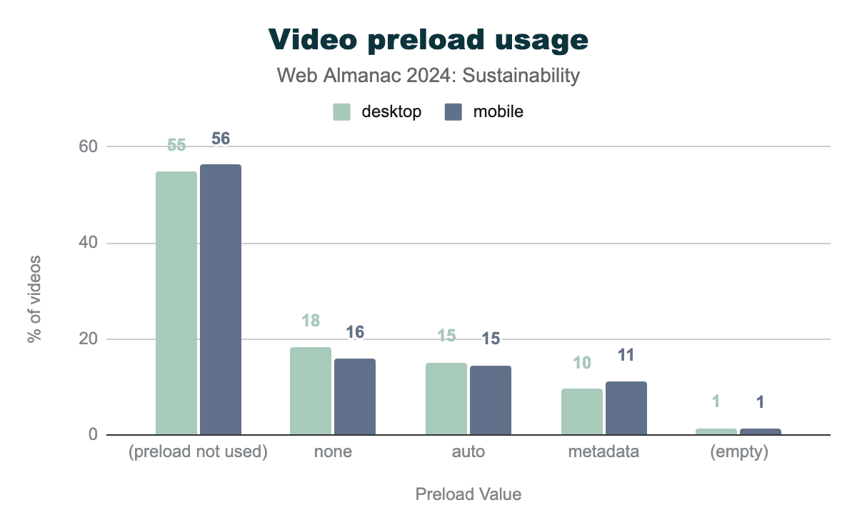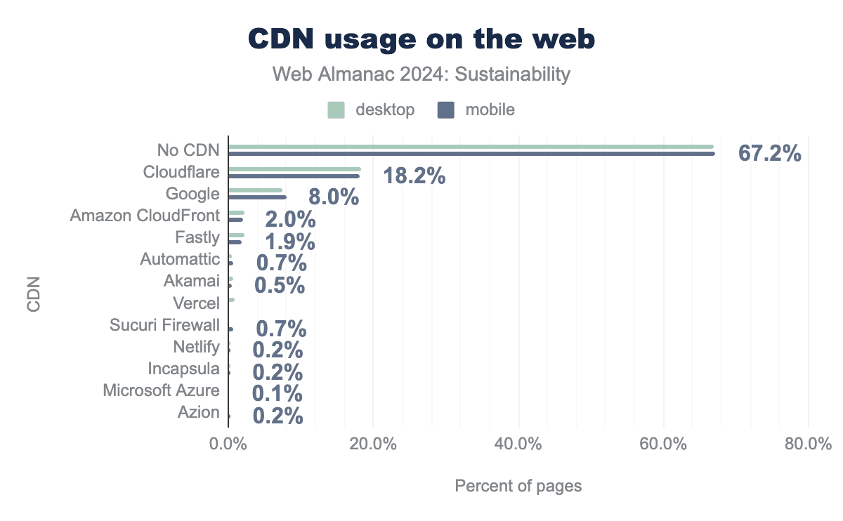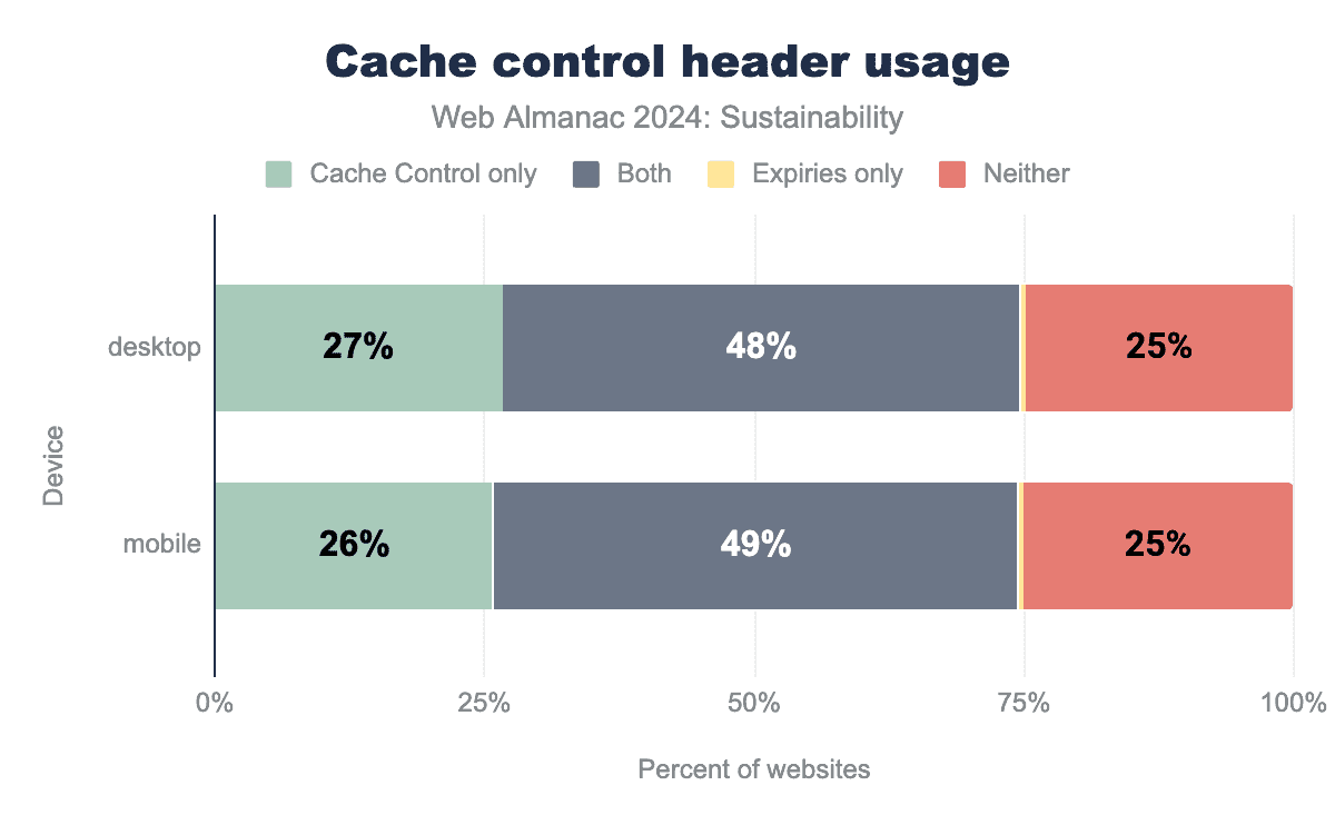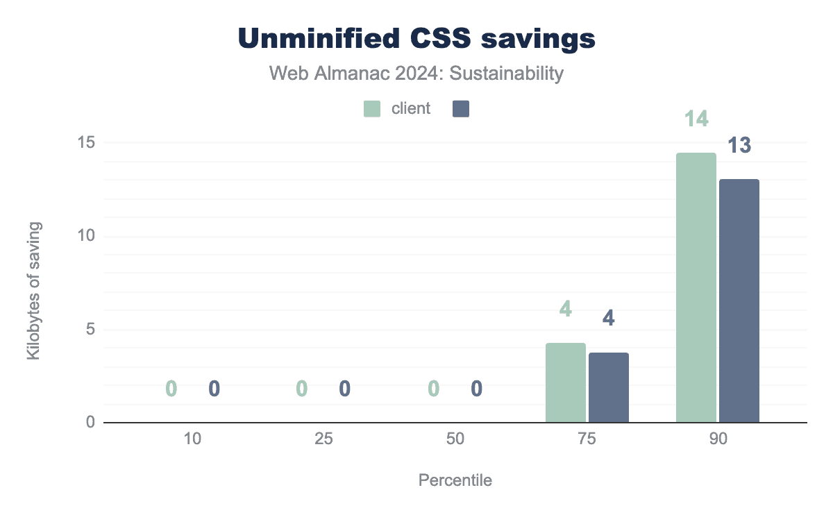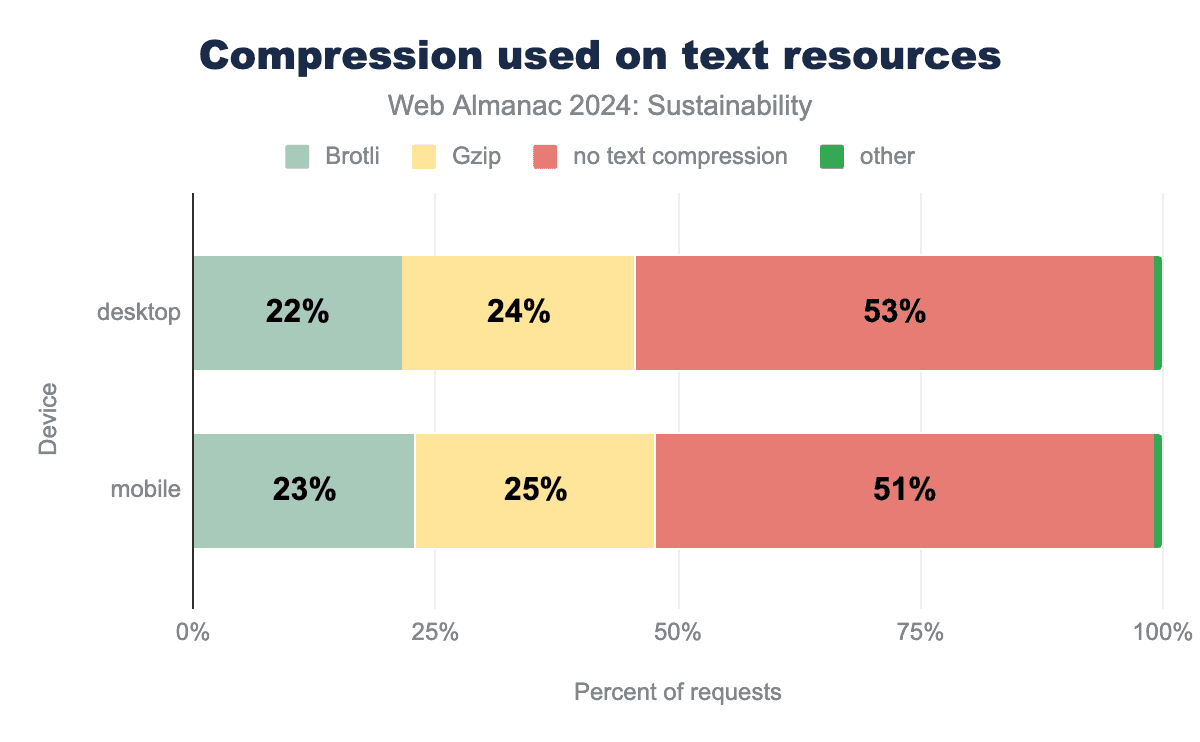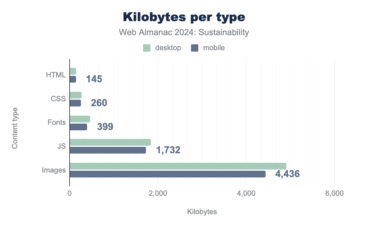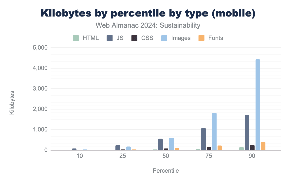 Page weight represents the amount of data transferred to access the web page (based only on HTTP requests). It is recommended that this metric be kept as low as possible to ensure a fast load and good user experience for all users. On the 90th percentile, the average mobile site weighs around 7.2 MB, while desktop ones are around 8 MB. The good news is that these numbers are slightly lower than the ones in the 2022 Almanac. The bad news is that these numbers are still way too high. When we talk about sustainability, we usually touch upon inclusion, and to make sure the majority of Internet users can access the page and have a decent user experience, page weight should be kept below 1MB, ideally around 500KB.