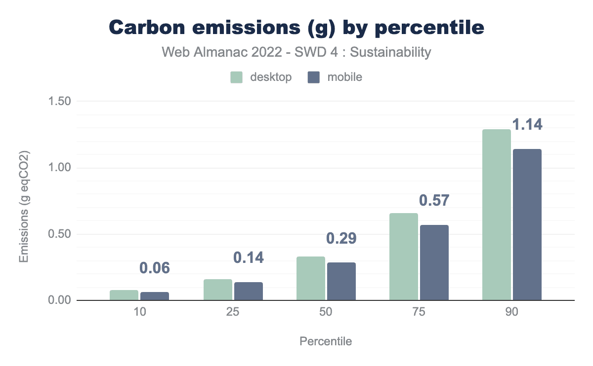 Even if the results are quite similar to those from 2022, we notice a slight increase in carbon emissions, which is even more significant for the 75 and 90 percentile. This is bad news as we should focus on reducing all our carbon emissions. This is not surprising since page weight has been globally on the rise for many years. More on this in the Page Weight chapter. The goal of the Sustainability chapter is precisely to raise awareness on this but also to provide recommendations to improve things.