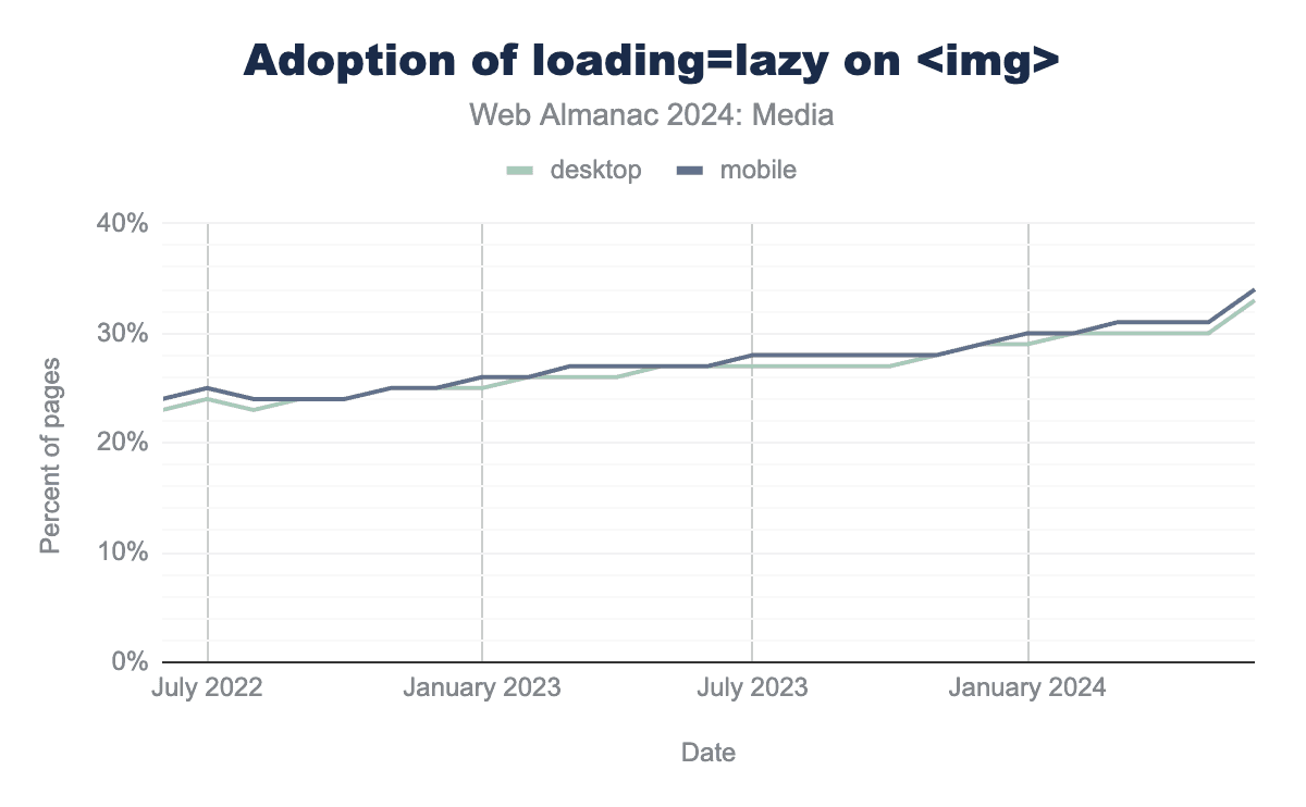 From the 90th percentile of collected data, it is clear that the largest portion, more than half of the page’s total weight, belongs to images. This is quite an expected result and one of the parts where small optimizations can have the biggest impact. Slightly surprising and worrying is that there is still a very small gap between desktop and mobile numbers, not only in images but across all types. This shows us that even though mobile-first became a concept over 15 years ago, most teams still don’t optimize their mobile sites to account for the limitations of mobile networks, phone plans, and smaller screens (for which smaller images are usually enough). In the end, it may look mobile-friendly, but the experience isn’t.