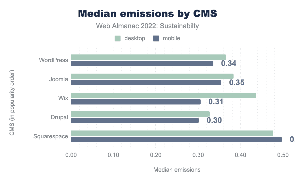Notably, all report a median mobile page weight above the overall median of 2 MB. Comparing these values to their 2022 median size demonstrates that most websites built with each CMS are heavier than they were 2 years ago, which confirms a tendency that we noticed on global emissions for all pages. The more significant growth is for Squarespace websites on desktop and Drupal still seems to fare better than others (even if there is room for improvement).