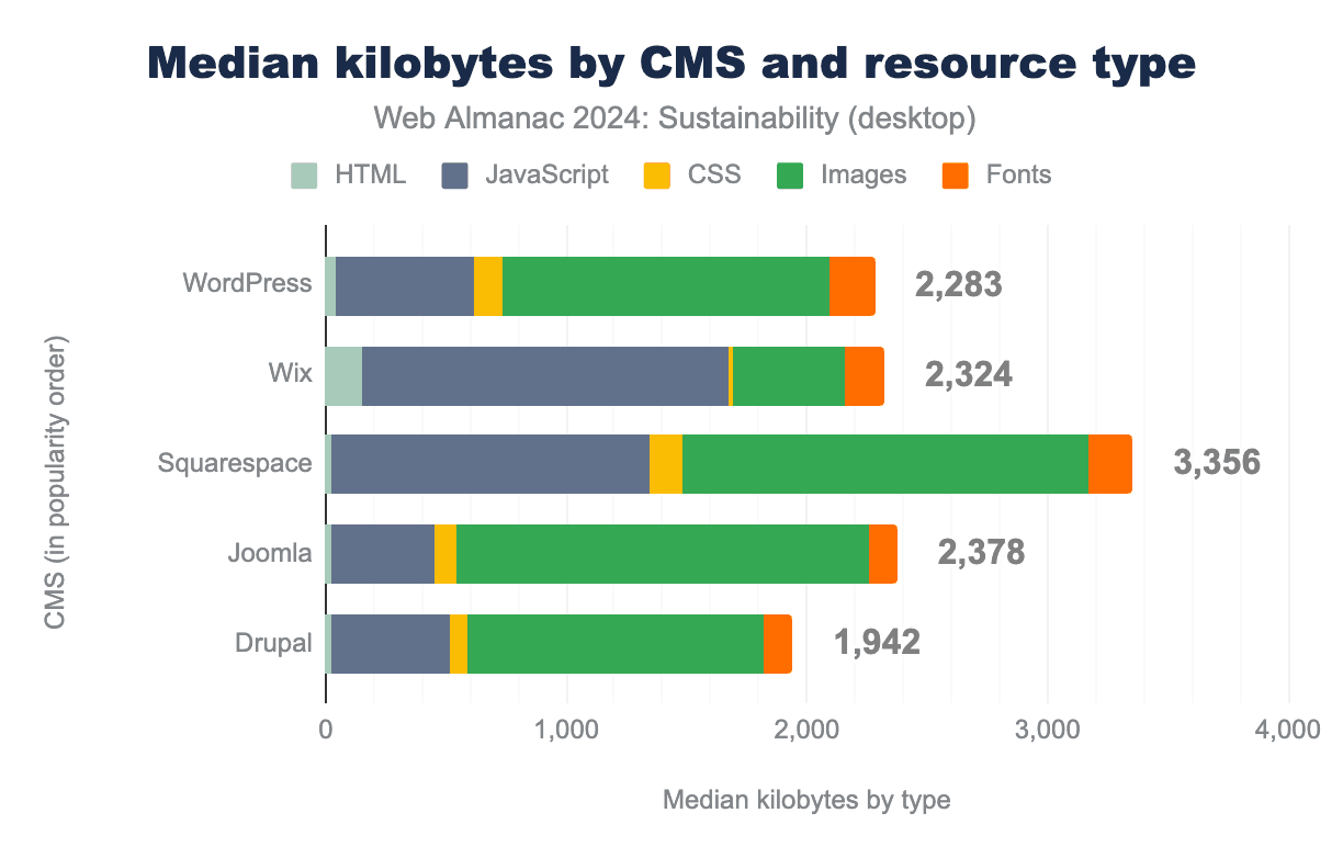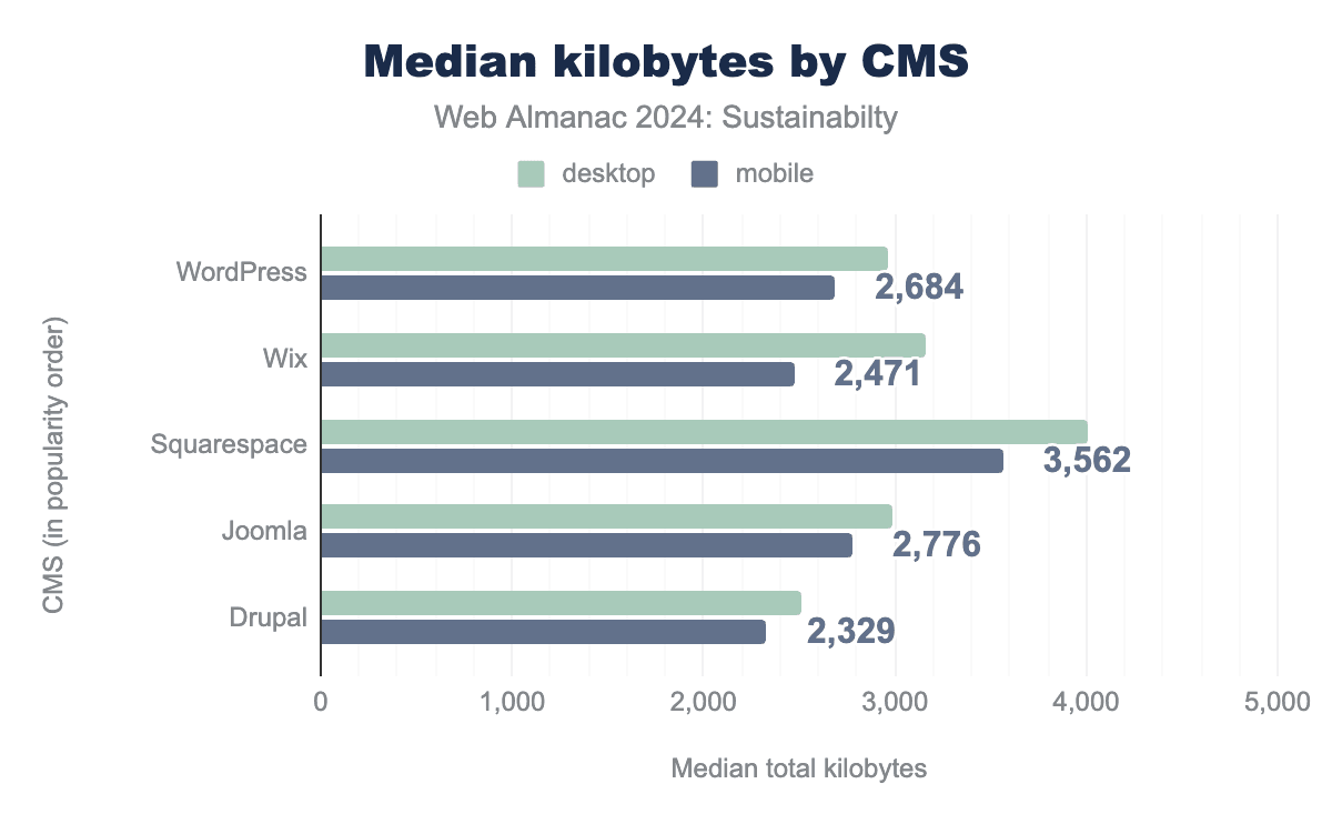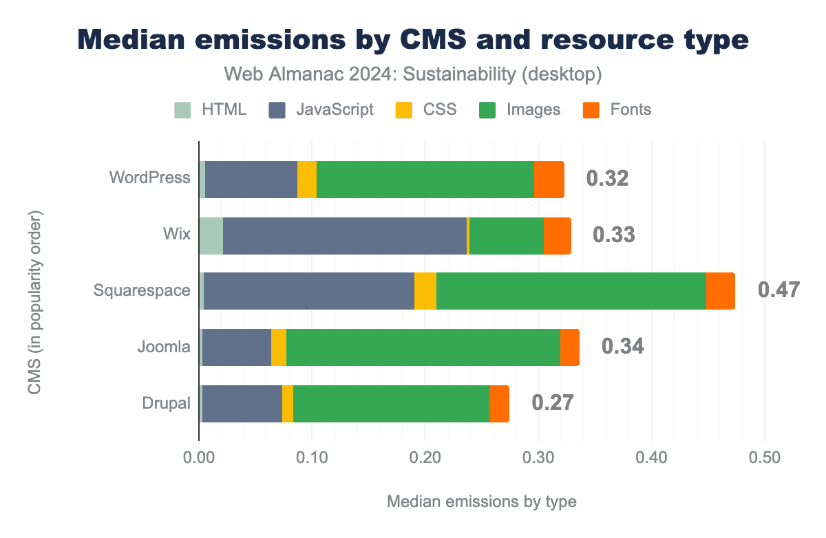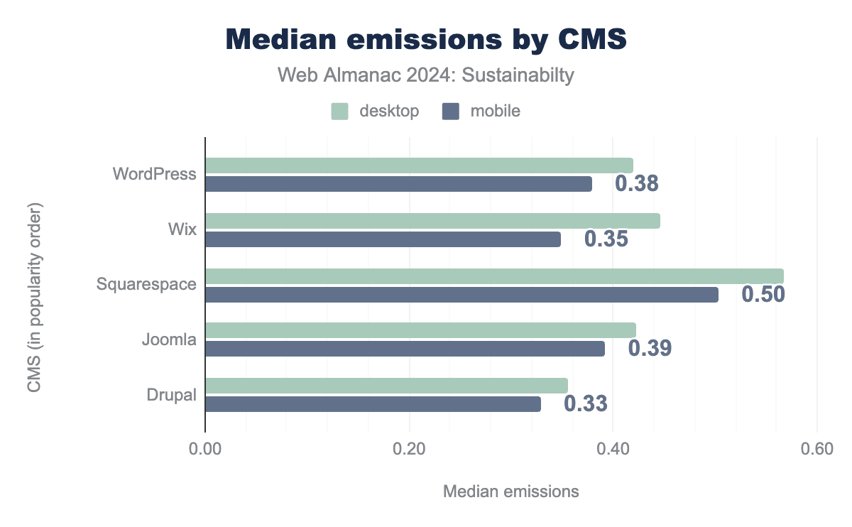 The 2024 scan included around 5 million instances of WordPress, 500,000 instances of Wix, 250,000 instances of Squarespace, 250,000 instances of Joomla, and 200,000 instances of Drupal. That’s over 6 million unique instances of these five CMS. So, even just generating this report does have a measurable climate impact.