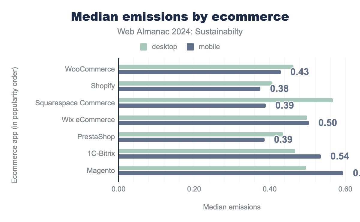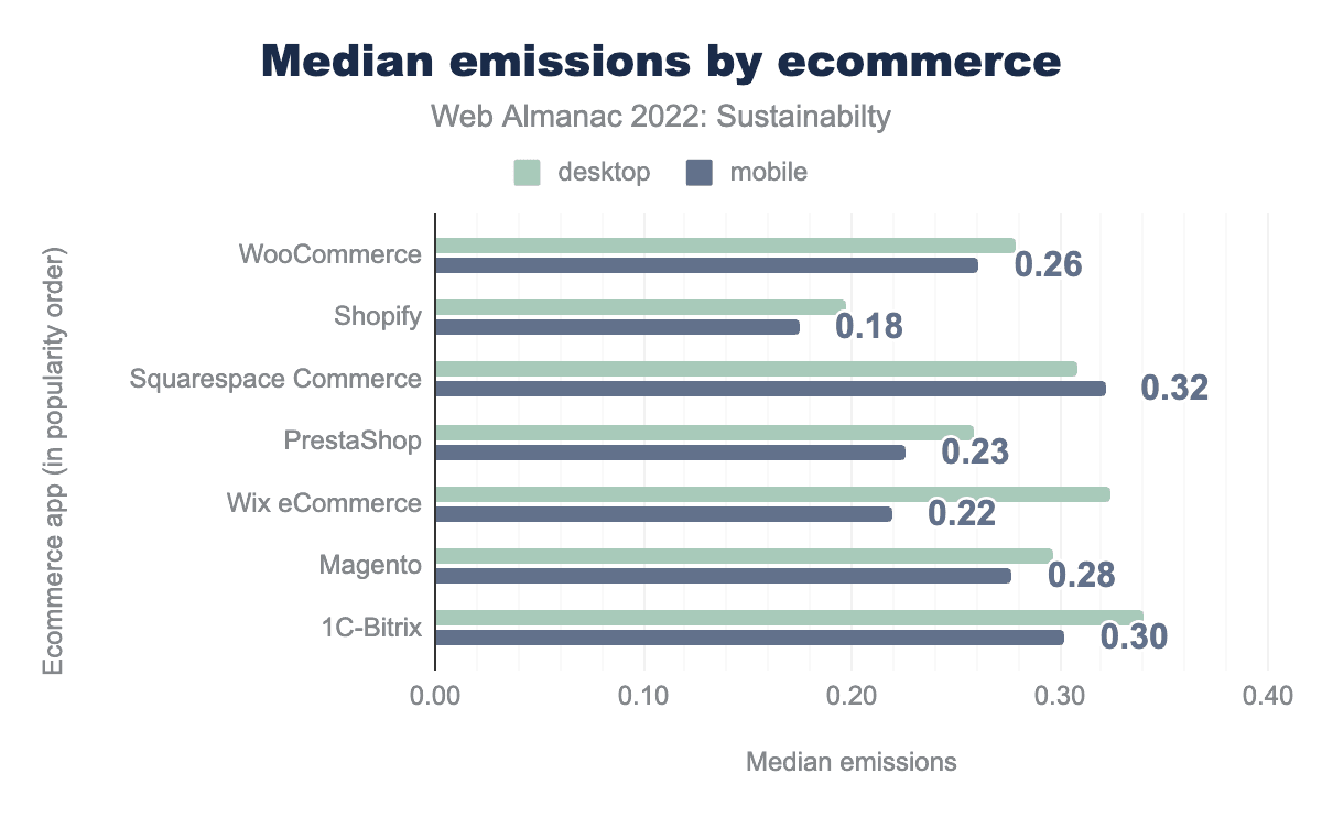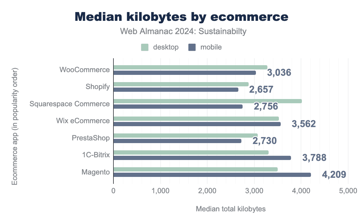 It is clear comparing the ecommerce platforms with other CMS platforms, that they are substantially heavier in their page-load size and their environmental impact. Since these figures mostly relate to home pages, we can only guess that this could be due to more products or less optimized content. However, this shows that there is still room for improvement.