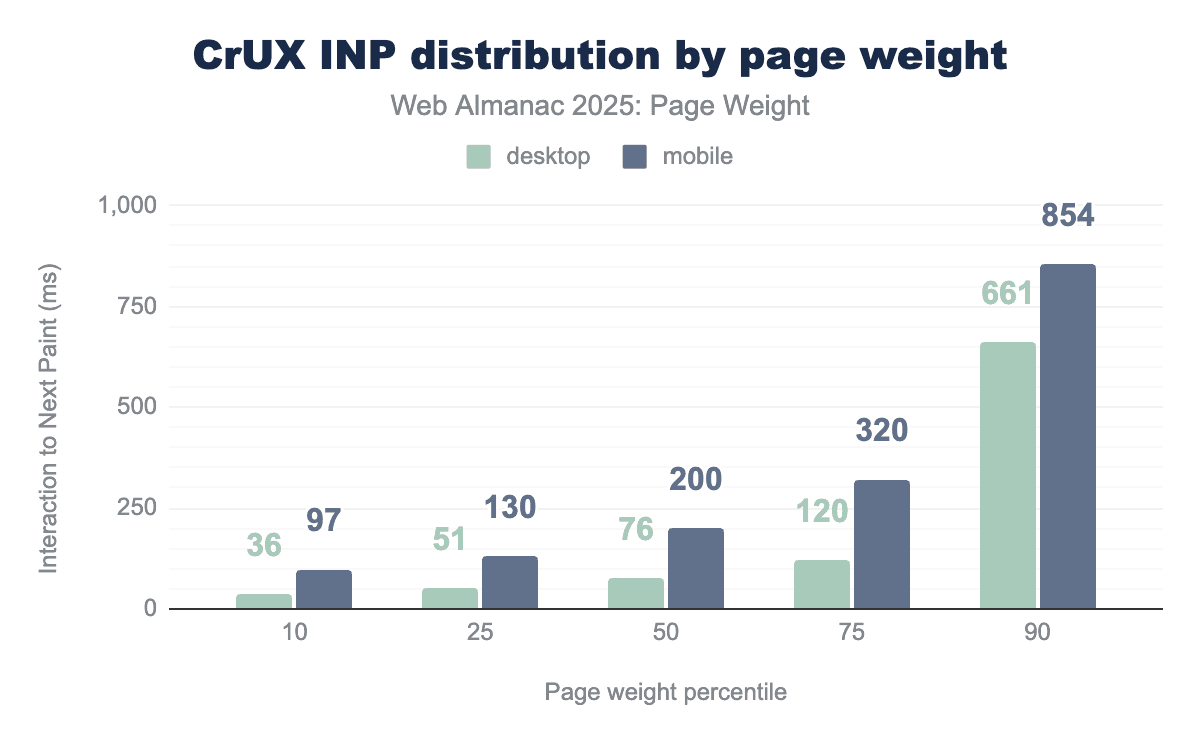 Desktop home pages consistently achieved INP times below the 200ms threshold across all weight categories even in the heaviest range, at 5 MB+, INP for the 75th percentile was just 82ms. Mobile home pages up to 3 MB achieved their INP goal. However, those in the 3-4 MB range, INP at the 75th percentile exceeded 200ms.