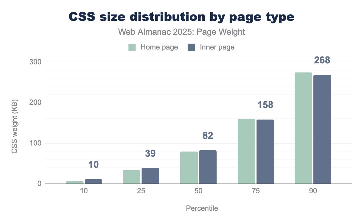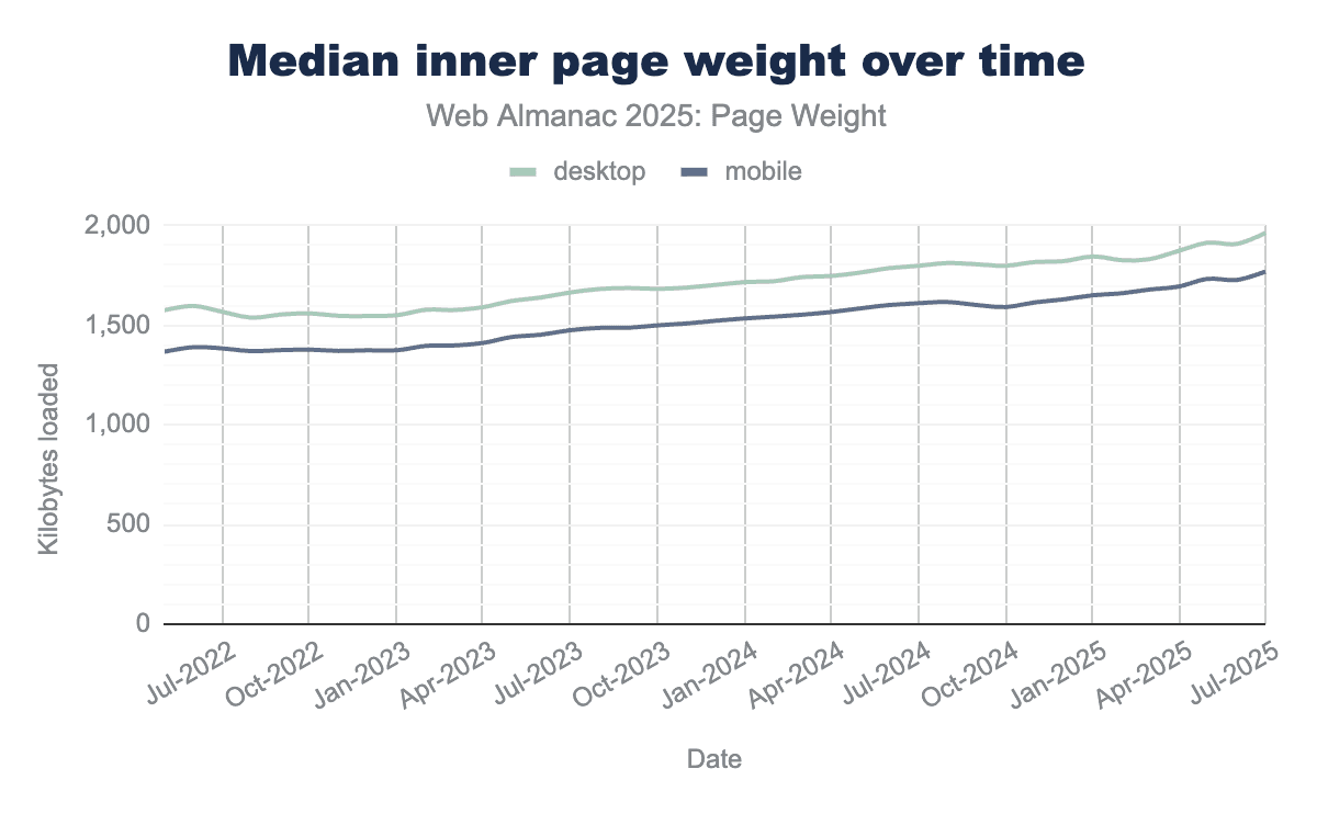As observed above, inner pages tend to be lighter than home pages. In 2025, the median home page weighted 2.9 MB for desktop and 2.6 MB for mobile. Inner pages were lighter in comparison, with median sizes of 1.8 MB for mobile, and 2 MB for desktop.