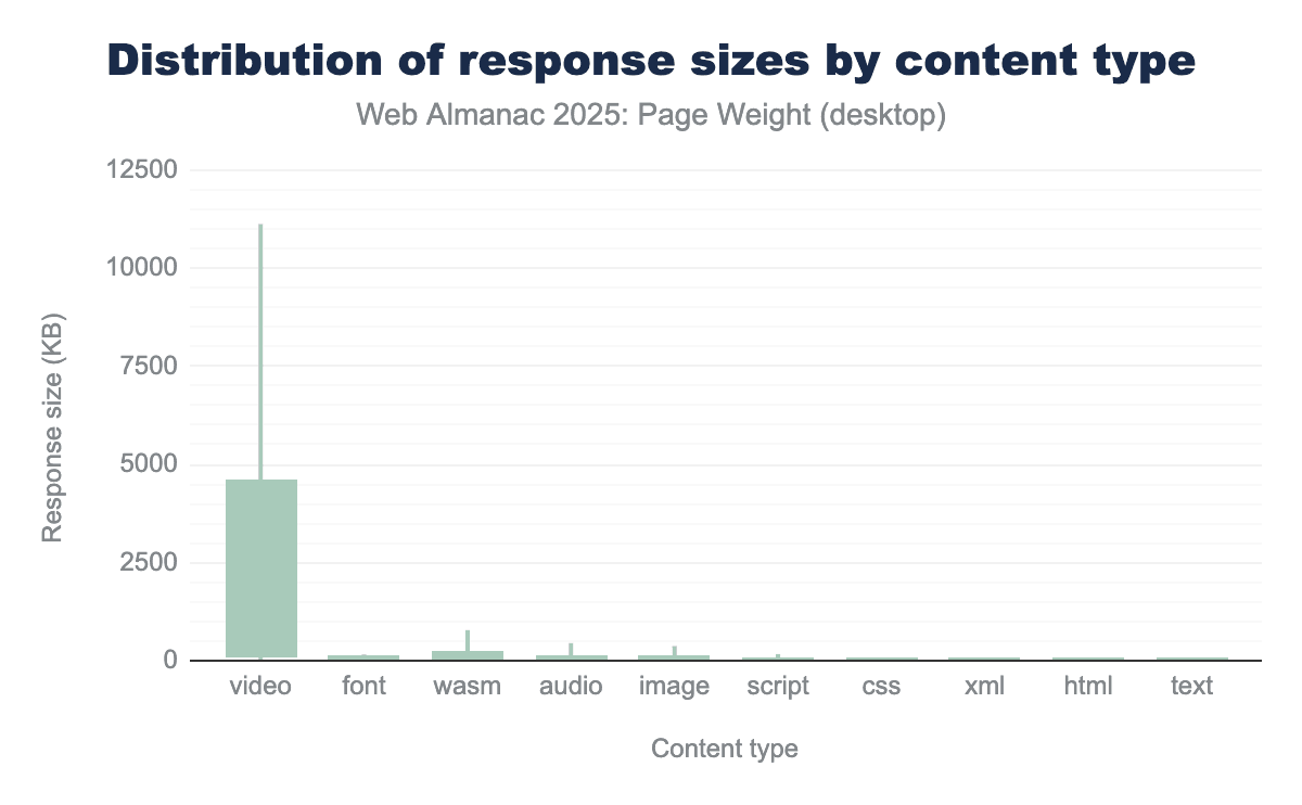 In this chapter, we analyze trillions of bytes across millions of websites to answer a fundamental question: Are we getting more value out of our payloads, or are we simply succumbing to “weight creep”? We will explore the dominance of media—images and video—which continue to claim the lion’s share of the transfer budget, and the steady rise of JavaScript, which carries a performance tax far heavier than its file size suggests.