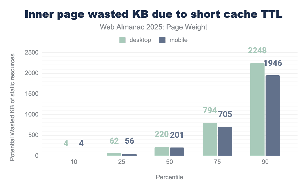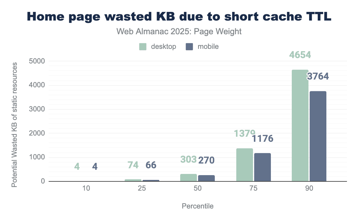 The data shows that many websites could reduce page weight by making better use of browser caching. For desktop home pages, the median site could save around 303 KB, while mobile home pages could save approximately 270 KB if resources were consistently loaded from cache.