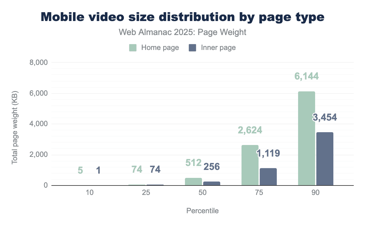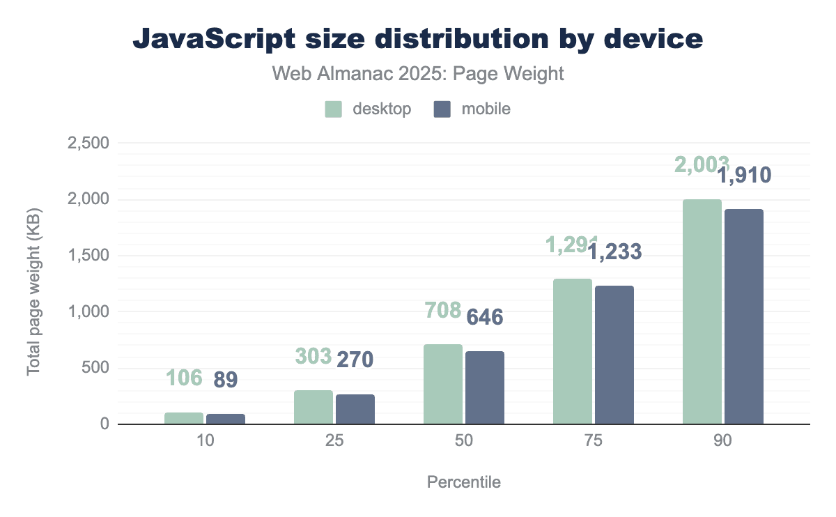Year over year, the median home page size grew 7.8% to 2.7 MB. The median mobile home page is 2.6 MB, growing 8.4% from 2.4 MB in 2024. In 2025, the median desktop page size reached 2.9 MB, up 7.3% from 2024’s median of 2.7 MB.