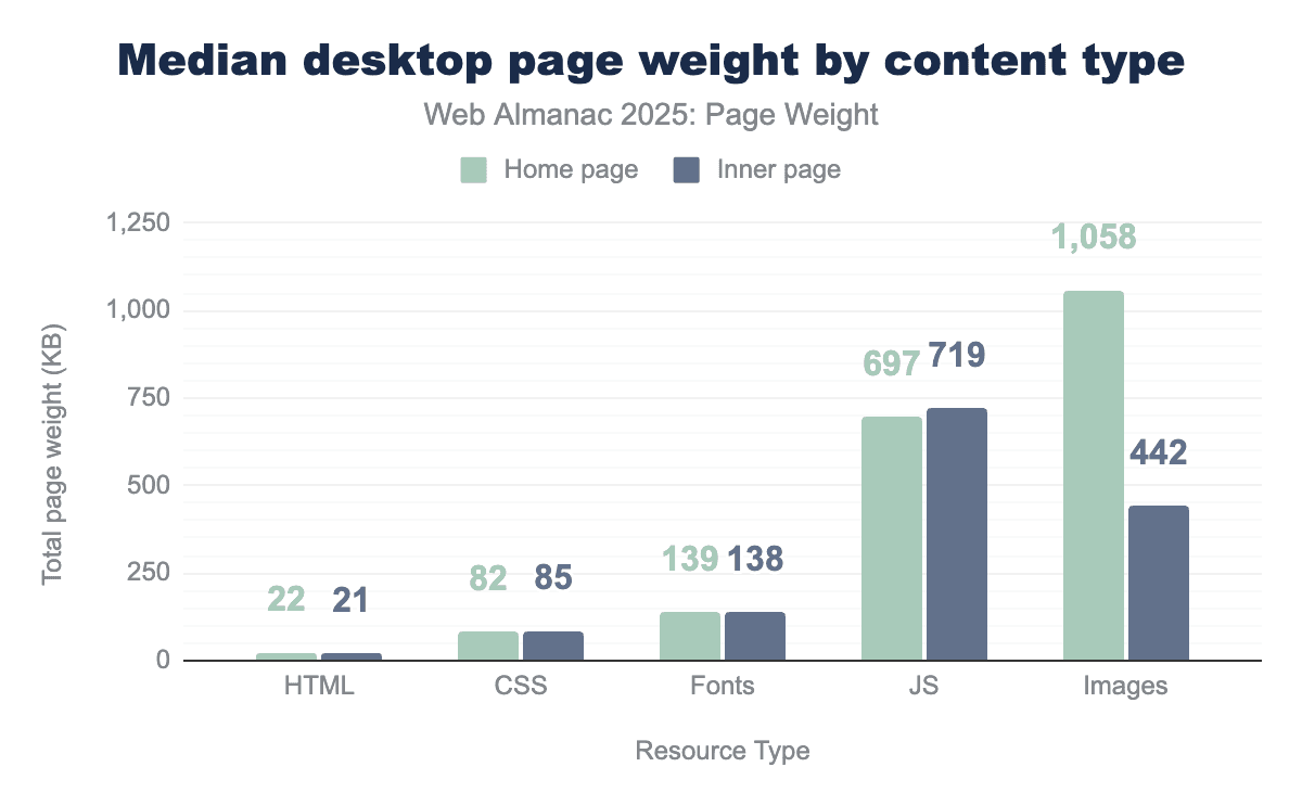 The median home page in 2025 was 2.86 MB on desktop and 2.56 MB on mobile. Images accounted for the most bytes on both mobile and desktop, followed by JavaScript and fonts.
