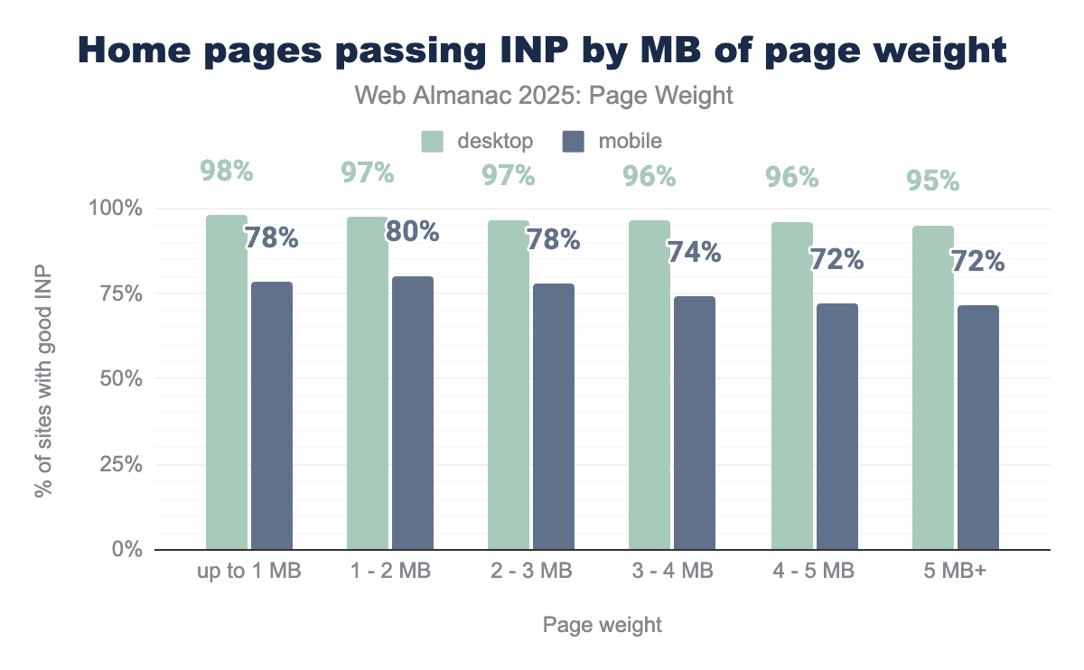 Mobile home pages passed at lower score rates, with 78% of pages up to 1 MB passing, while those pages in the 1-2 MB range performed slightly better, with 80% of them achieving INP in under 200 ms.