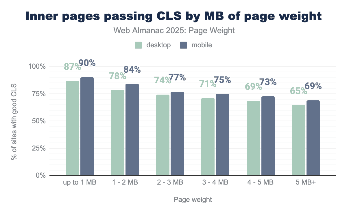 A passing CLS score is ≤ 0.10. CLS scores were consistently higher on desktop, likely because the larger landscape provides more space for items to shift. Pages below 2 MB passed the assessment on desktop, while pages below 4 MB achieved the desired score on mobile.